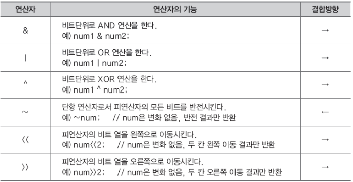 아래의 표는 비트연산자의 종류와 그에 따른 기능입니다.